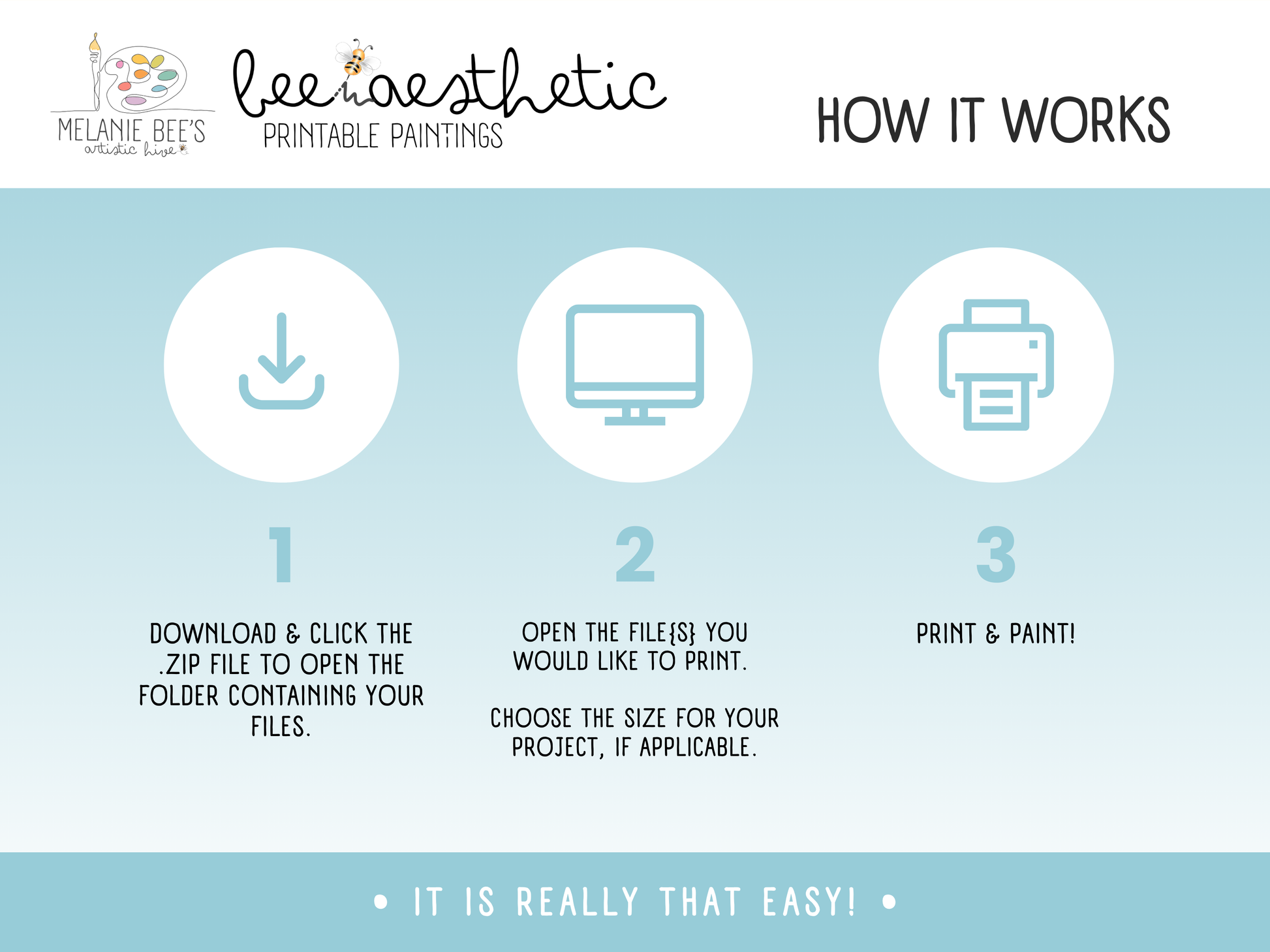 Designed by Melanie B, the “Aesthetic Bee” is a printable painting kit that has simple designs with NO NUMBERS. Using the new “BEE AESTHETIC Printable Paintings”, your experience & existing supplies, you will be painting stylistic designs with a minimal color palette and without a number reference. These kits are created specifically for the bee who loves the aesthetic appeal of clean & simple imagery, but who also wants to fly outside the honeycomb, and do their own thing.